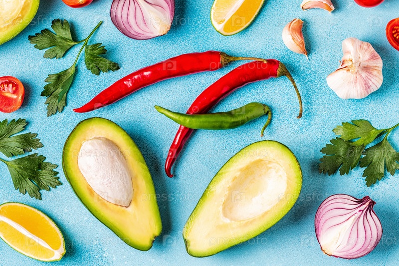 Ингредиенты для гуакамоле: авокадо, лайм, помидор, лук и специи