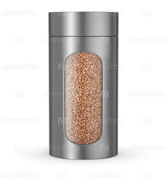 Пищевая банка с сухой гречкой на белом фоне