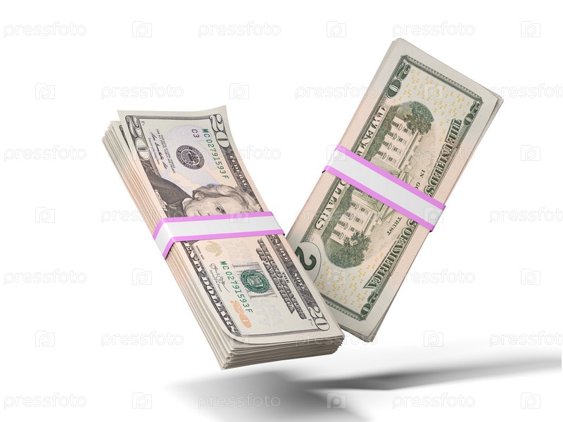 Пачки по двадцать долларов на белом фоне