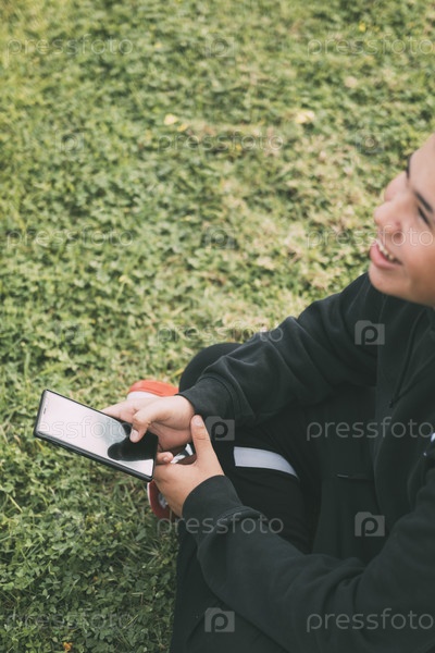 Улыбающийся латиноамериканский подросток смотрит на экран своего смартфона