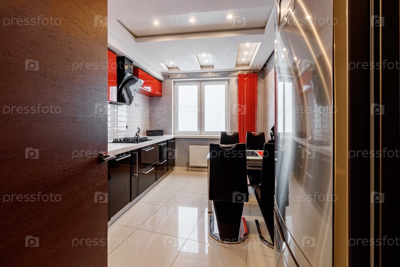 Современный интерьер кухни с красными и черными шкафами и белым керамическим полом