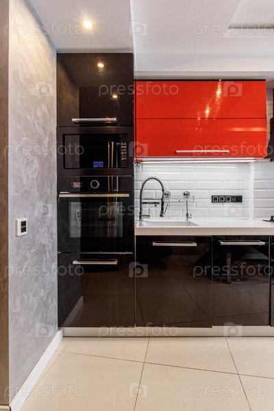 Современный интерьер кухни с красными и черными шкафами и белым керамическим полом