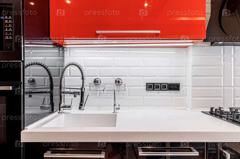 Смеситель для кухни черный, возле стены с глянцевыми белыми кирпичами и глянцевыми черно-красными шкафчиками