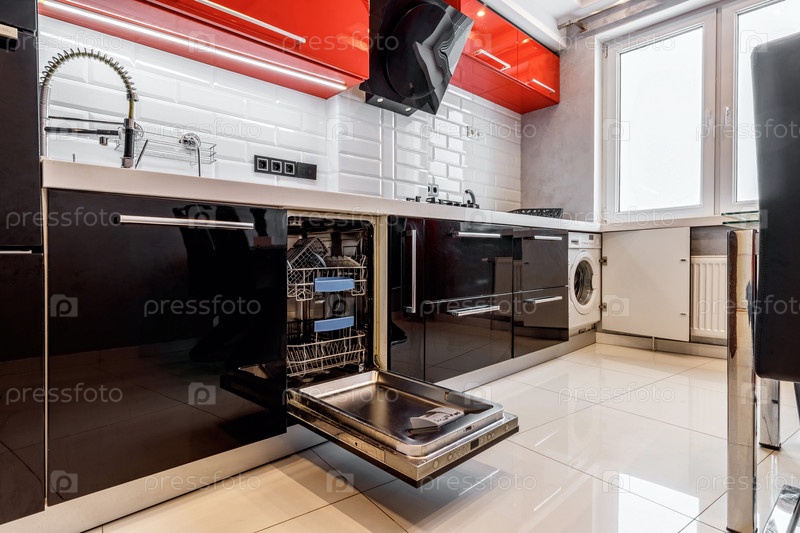 Современная полуоткрытая пустая посудомоечная машина на современной кухне
