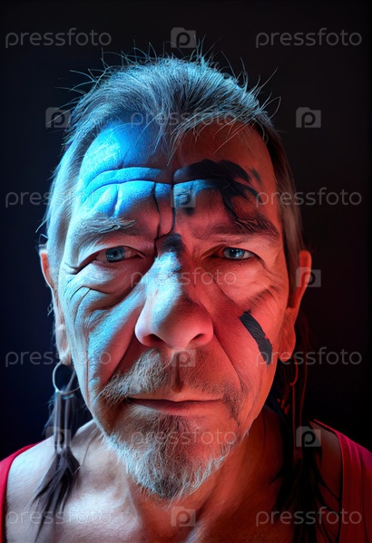 Серьезный портрет старого вождя коренных американцев с племенным макияжем пантеры, генеративный ии (есть релиз модели)