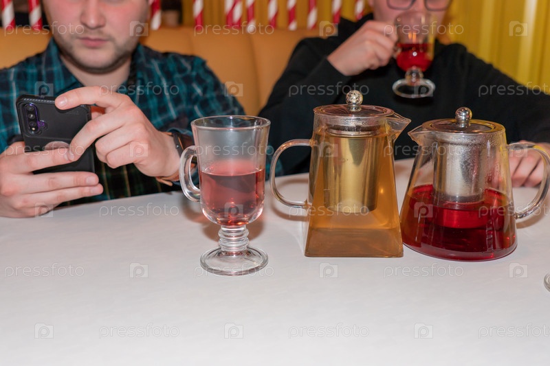 Зеленый чай в стеклянном чайнике рядом с пуншем из красного чая, крупным планом на белом столе