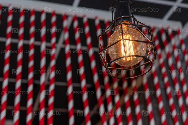 Винтажная лампа накаливания Эдисона, ретро стиль в кафе, теплый фон