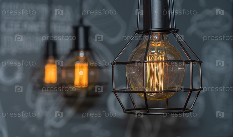 Винтажная лампа накаливания Эдисона, ретро стиль в кафе, теплый фон