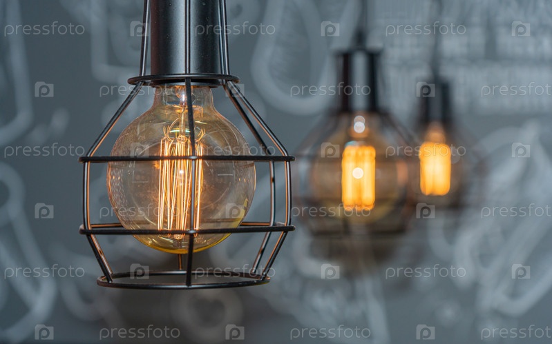 Винтажная лампа накаливания Эдисона, ретро-стиль в кафе, теплый фон