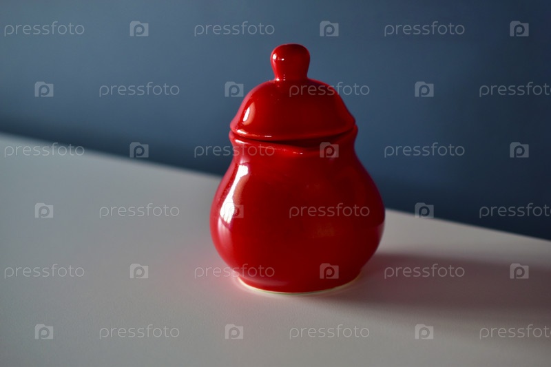 Красный керамический молочник на синем фоне