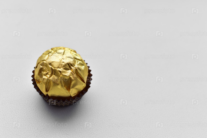 Круглые шоколадные конфеты в золотой обертке на белом фоне