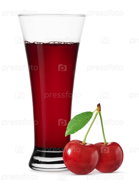 Стакан вишневого сока с ягодой, изолированной на белом
