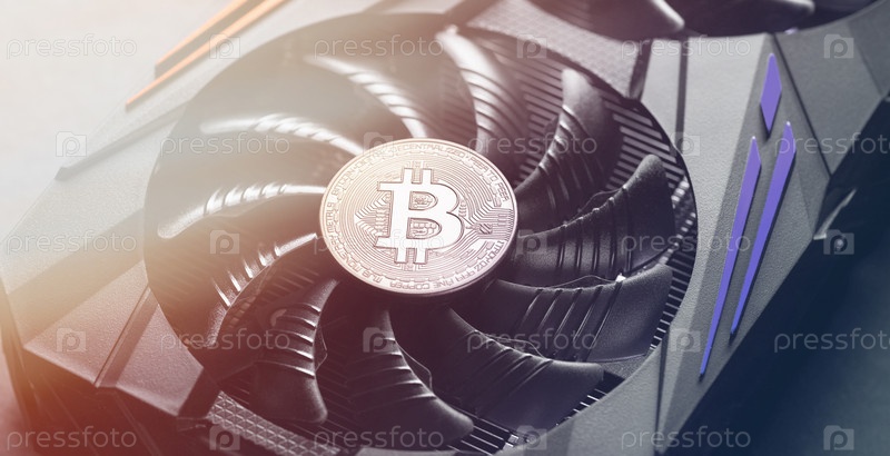 Монета биткойн на графической карте. Майнинг криптовалюты