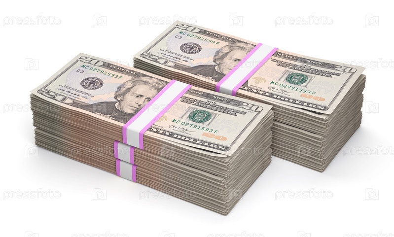 Пачки по двадцать долларов на белом фоне