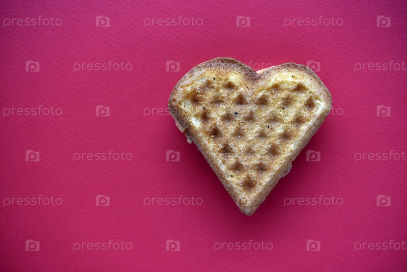 Вафельные сердечки на красном фоне. День святого Валентина. Кондитерские изделия в форме сердца