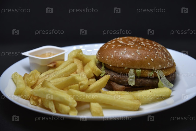 Два гамбургера с мясом и картофелем фри на тарелке. Вкусный фаст-фуд. Гамбургеры