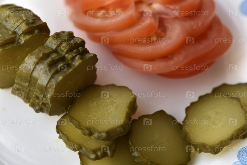 Нарезанные огурцы и помидоры. Кусочки овощей крупным планом