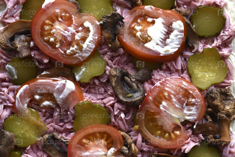 Нарезанные помидоры. Овощная начинка для пиццы. Грибы и помидоры на пиццу