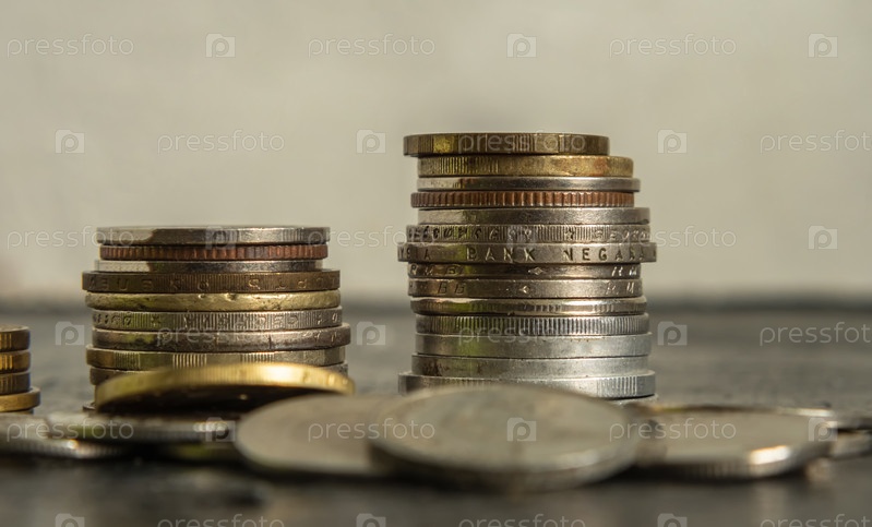 Две стопки разных монет на фоне кучи других монет. Выборочный фокус. Концепция финансов и сбережений. Крупный план