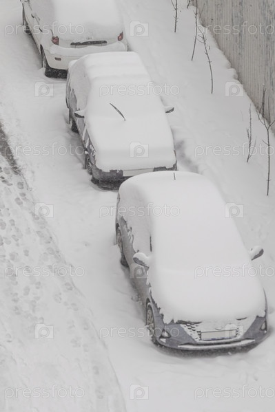 Машины, припаркованные возле дома, были засыпаны снегом. Снежная зима в городе