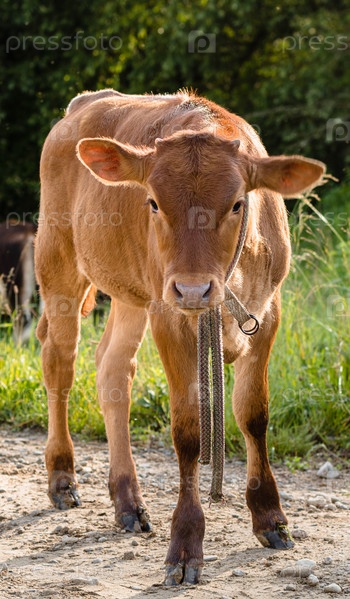 Коричневый теленок с веревкой смотрит в камеру. Концепция развития крупного рогатого скота