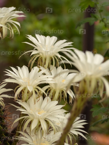 Кактус, цветущий большими белыми цветами в летнем саду