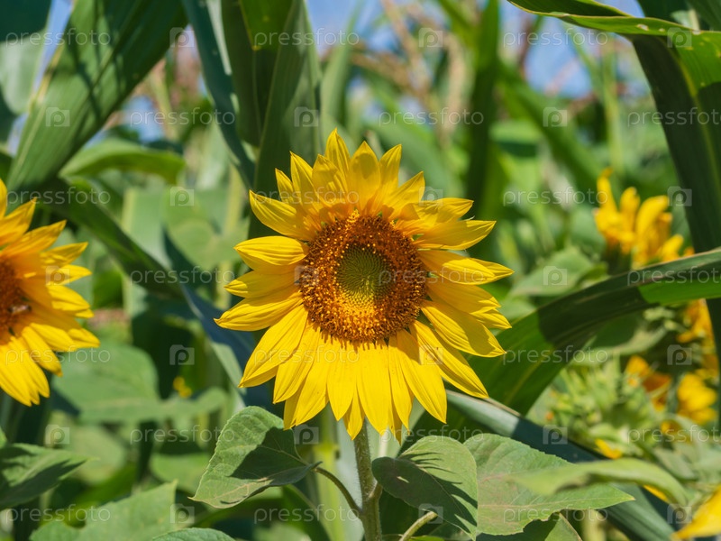 Цветущий подсолнух на кукурузном поле. Сельскохозяйственное поле. Растениеводство