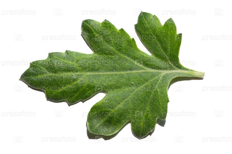 Яркий сочный зеленый лист, изолированный на белом. Крупным планом лист хризантемы, изолированные на белом фоне