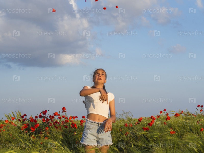 Красивая девушка подбросила в воздух лепестки мака. Девочка-подросток в весеннем поле с красными маками. Счастливая девушка в повседневной одежде на поле маков наслаждается свободным летним временем. Образ жизни реальных людей