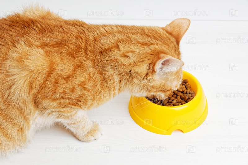 Рыжий кот ест еду из желтой миски на белом деревянном полу