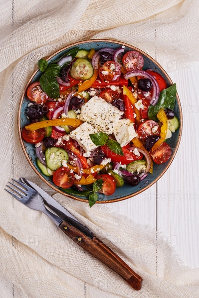 Греческий салат со свежими овощами, сыром фета, маслинами