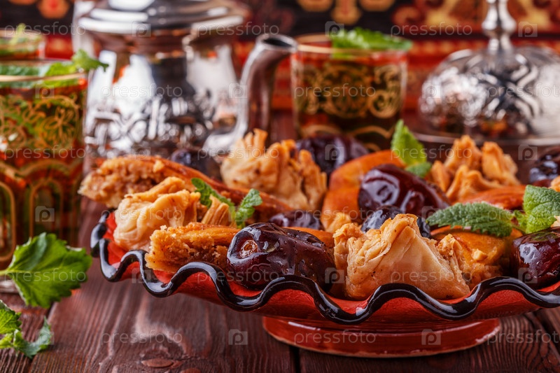 Марокканский мятный чай в традиционных стаканах со сладостями