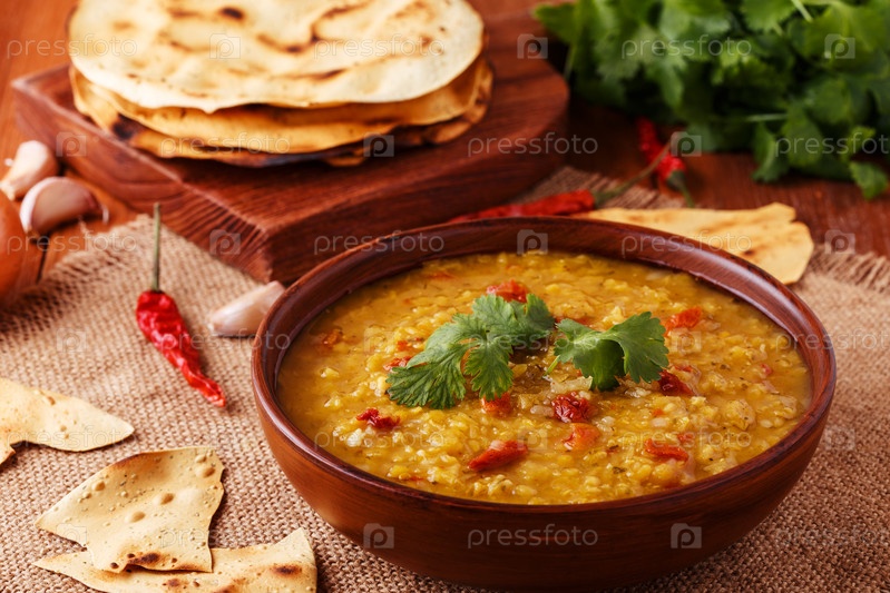 Густой индийский суп из красной чечевицы с кинзой, подается с индийскими лепешками
