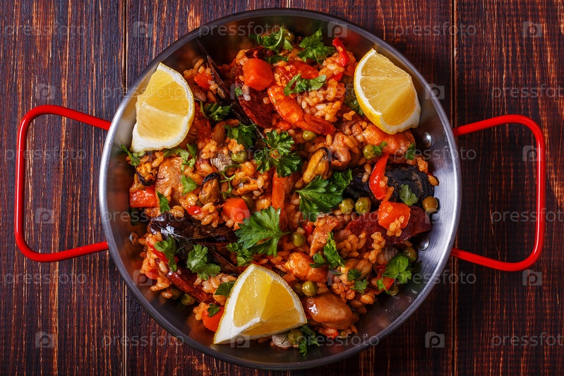 Паэлья с курицей, чоризо, морепродуктами, овощами и шафраном на традиционной сковороде