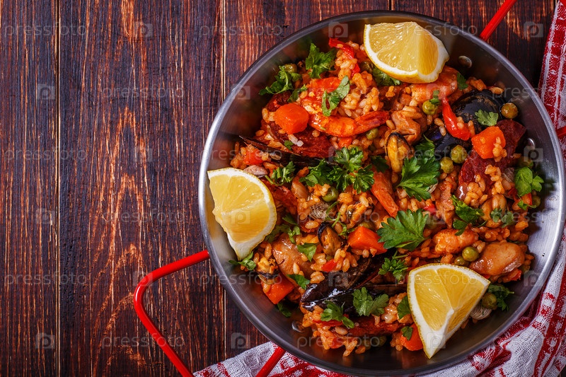 Паэлья с курицей, чоризо, морепродуктами, овощами и шафраном на традиционной сковороде