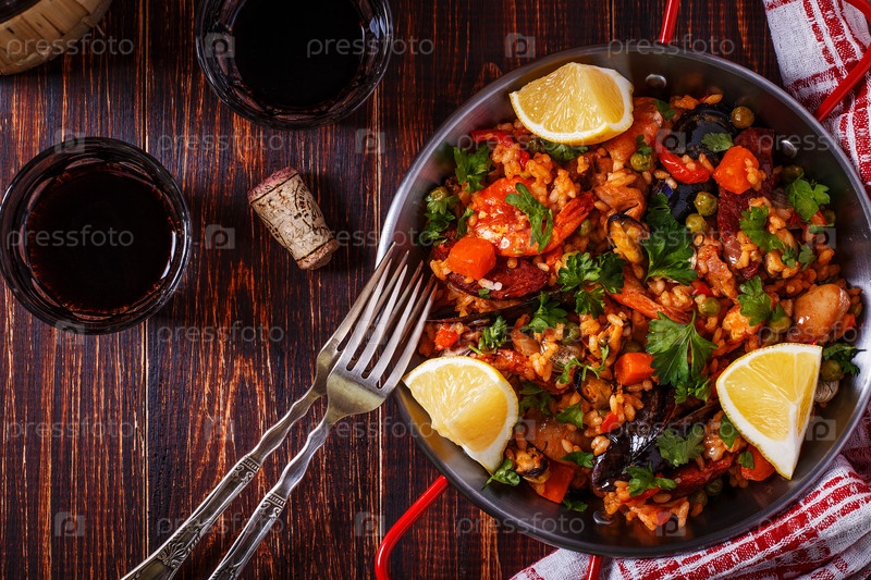 Паэлья с курицей, чоризо, морепродуктами, овощами и шафраном на традиционной сковороде