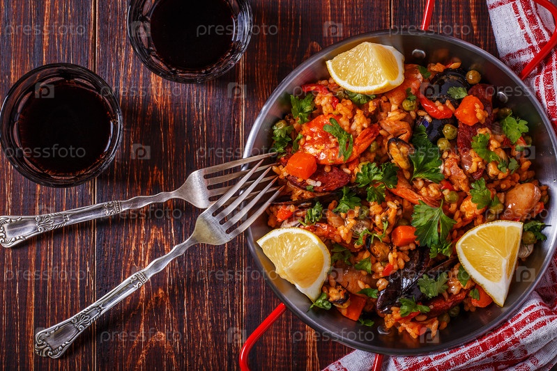 Паэлья с курицей, чоризо, морепродуктами, овощами и шафраном на традиционной сковороде