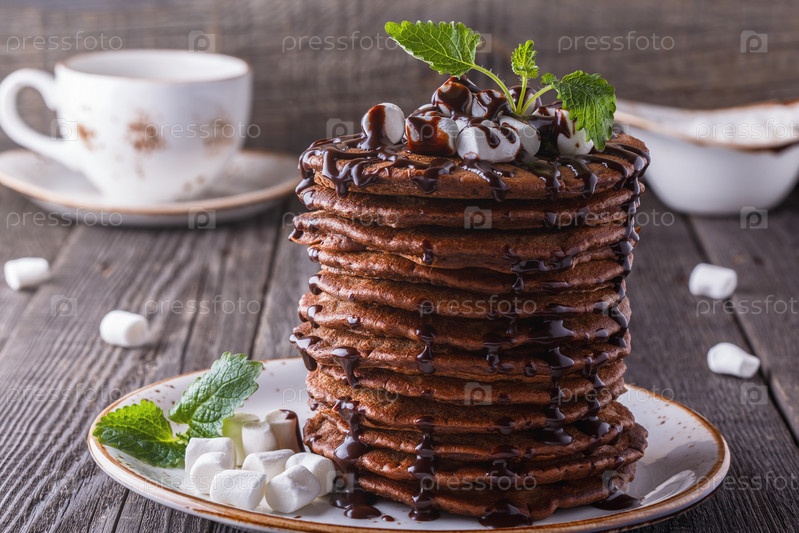 Стек блинов с зефиром и шоколадным сиропом