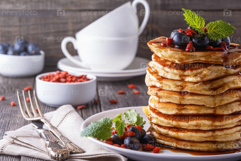 Стопка блинчиков со свежей черникой, годжи и кленовым сиропом