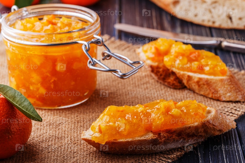 Апельсиновое (мандариновое) варенье в стеклянной банке на столе