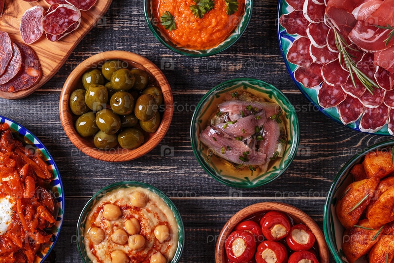 Типичная испанская концепция тапас, деревенский стиль, вид сверху