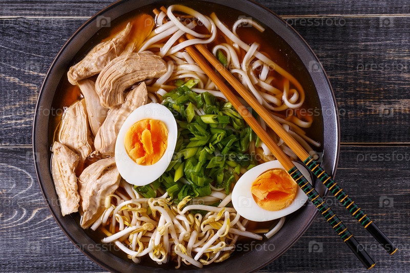 Японский суп рамен с курицей, яйцом, зеленым луком и ростками