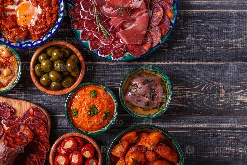 Типичная испанская концепция тапас, деревенский стиль, вид сверху