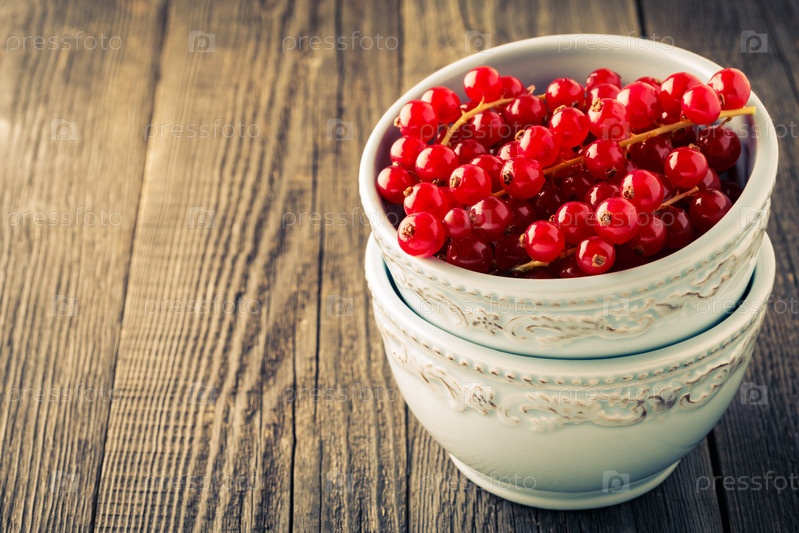 Свежая красная смородина в миске на деревянном фоне