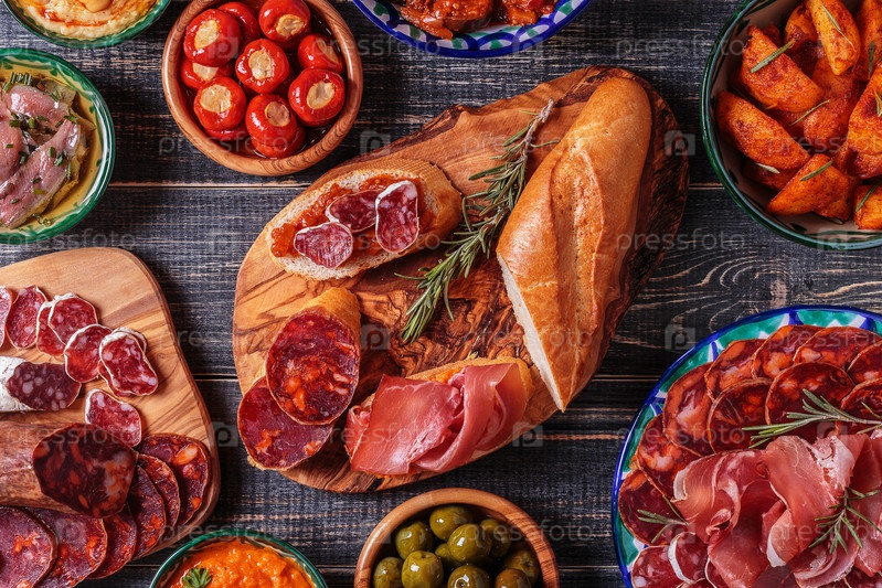 Типичная испанская концепция тапас, деревенский стиль, вид сверху