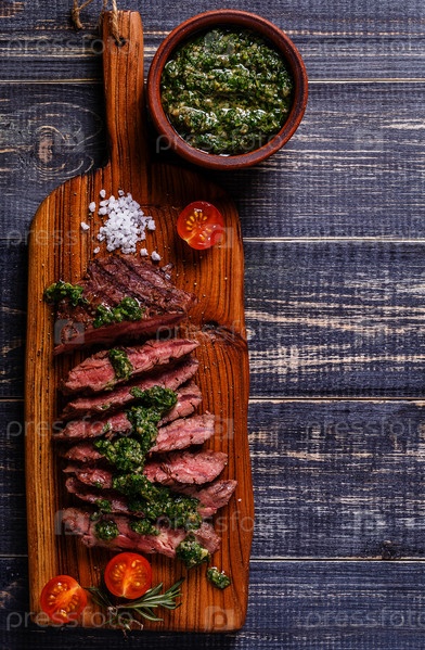 Стейк подается на доске с сальсой верде