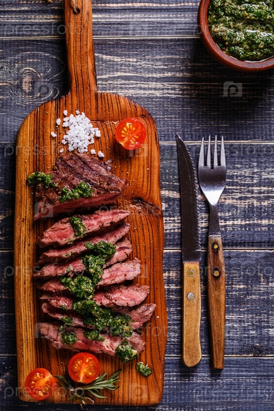 Стейк подается на доске с сальсой верде