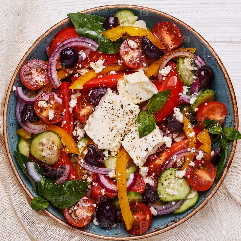 Греческий салат со свежими овощами, сыром фета, маслинами