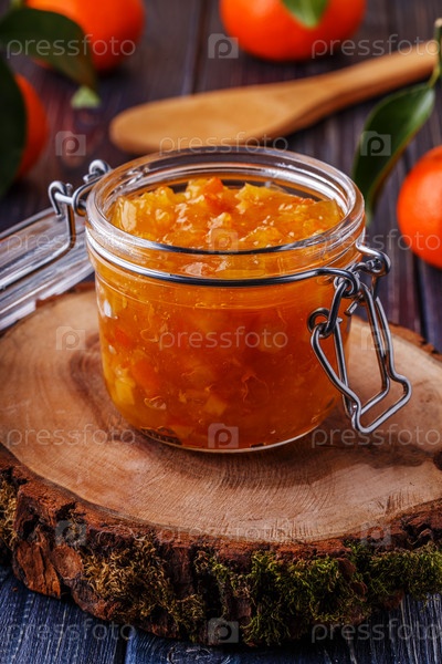 Апельсиновое (мандариновое) варенье в стеклянной банке на столе