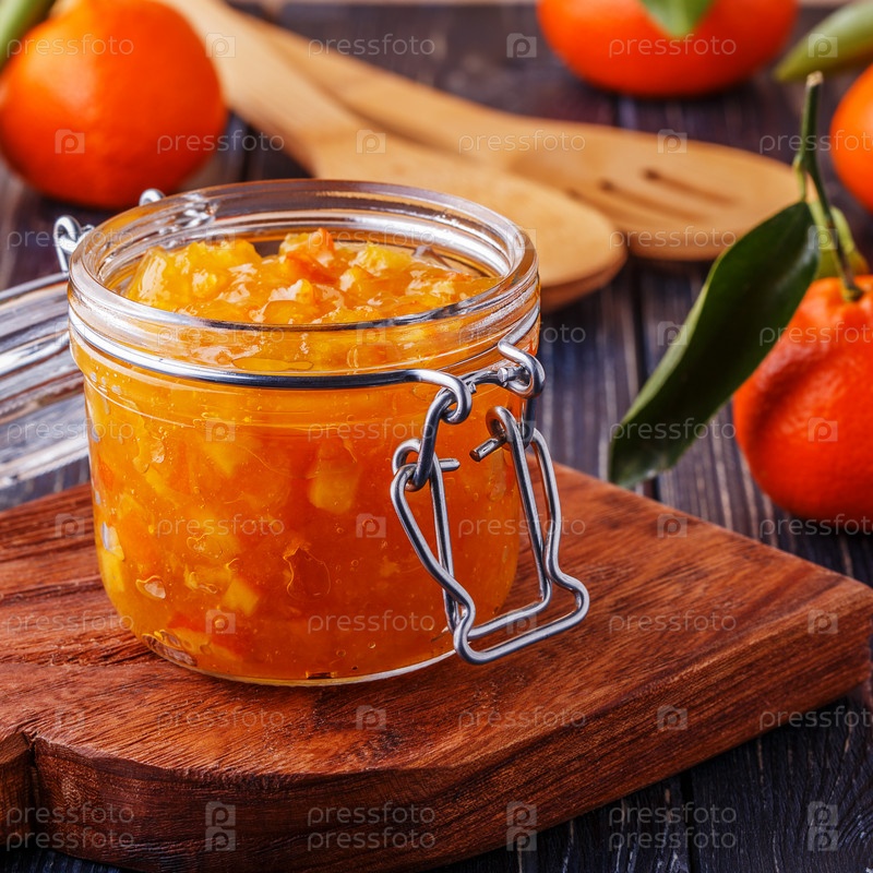 Апельсиновое (мандариновое) варенье в стеклянной банке на столе